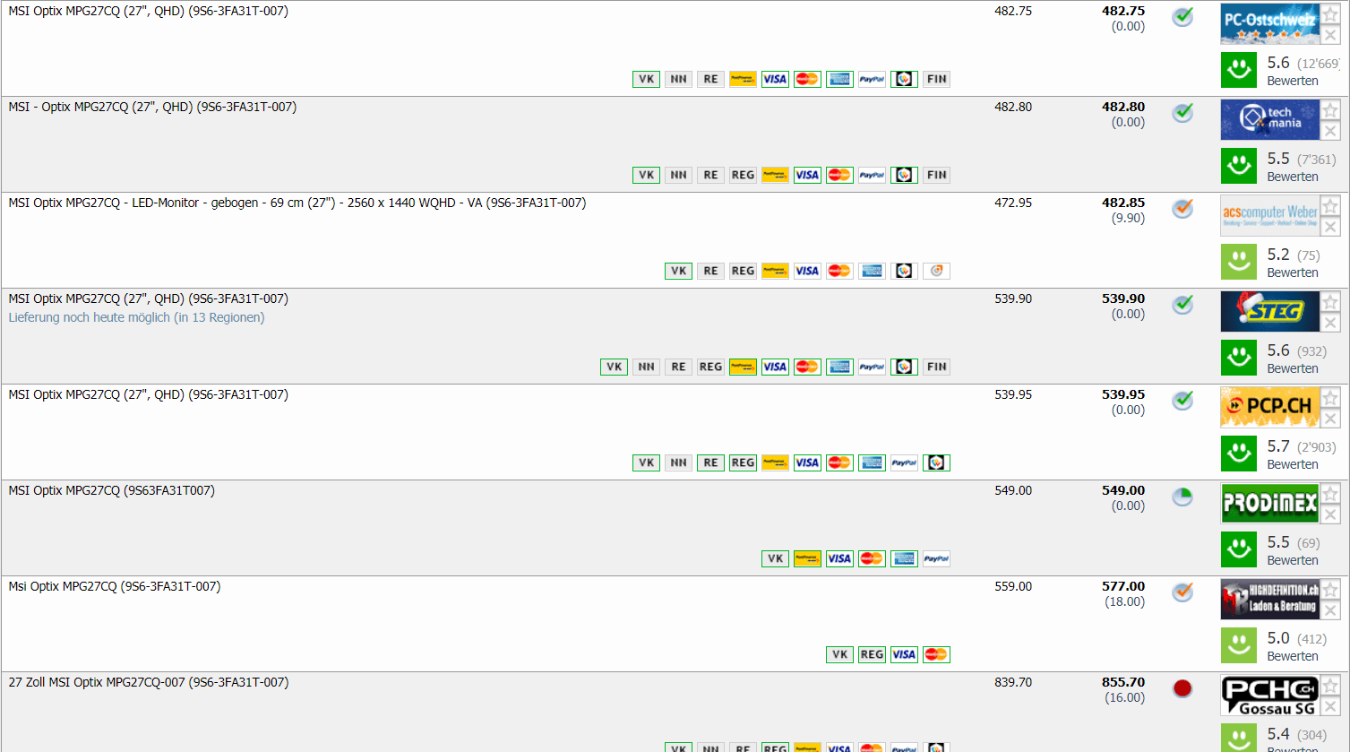 Bei digitec im Sale gibt’s gerade den Gaming-Monitor MSI Optix MPG27CQ-007 Curved mit einer Bildschirmdiagonale von 27″ und einer Auflösung von 2560 x 1440 Pixels für CHF 429.- Zweitbester Preis in der Schweiz ist bei CHF 482.75 was gleichzeitig auch der Bestpreis ist.