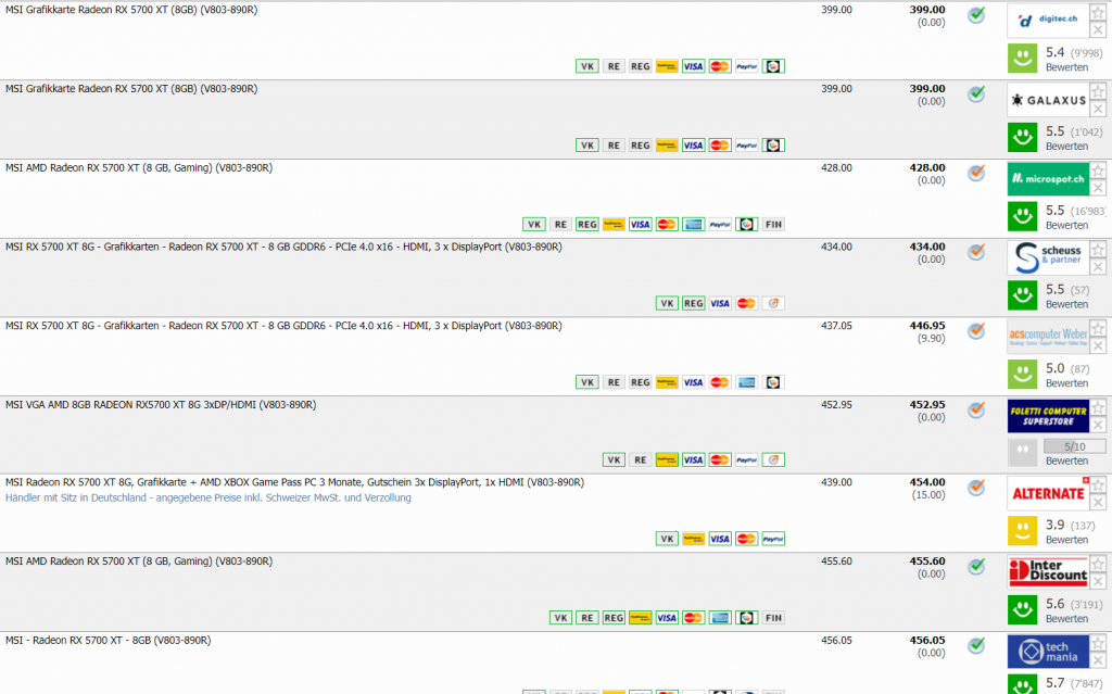 Bei digitec gibt’s die Grafikkarte MSI Radeon RX 5700 XT gerade für CHF 399.- das ist neuer Bestpreis. Vormaliger Bestpreis war bei CHF 427.40, zweitbester Preis beträgt CHF 428.-