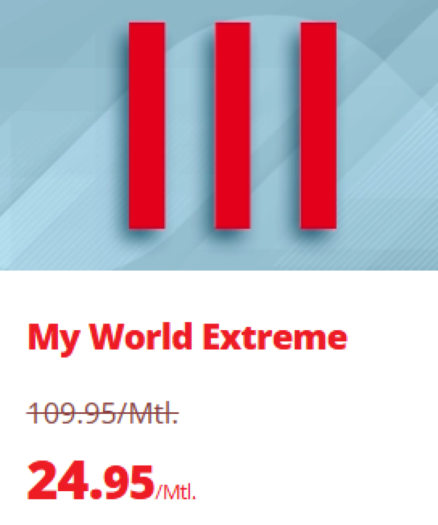 MTEL bietet seinen Top-Tarif My World Extreme aktuell mit einem dauerhaften Rabatt von CHF 85.00/Mt. an – statt regulär CHF 109.95 bezahlt ihr nur CHF 24.95/Monat. Dazu entfällt die Aktivierungsgebühr von CHF 39.00. Kein Mindestvertrag, kein Haken.