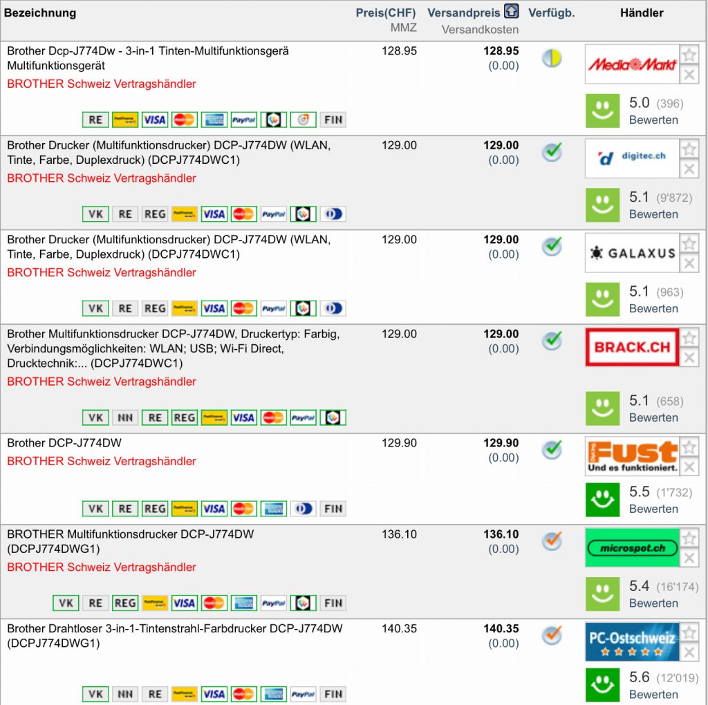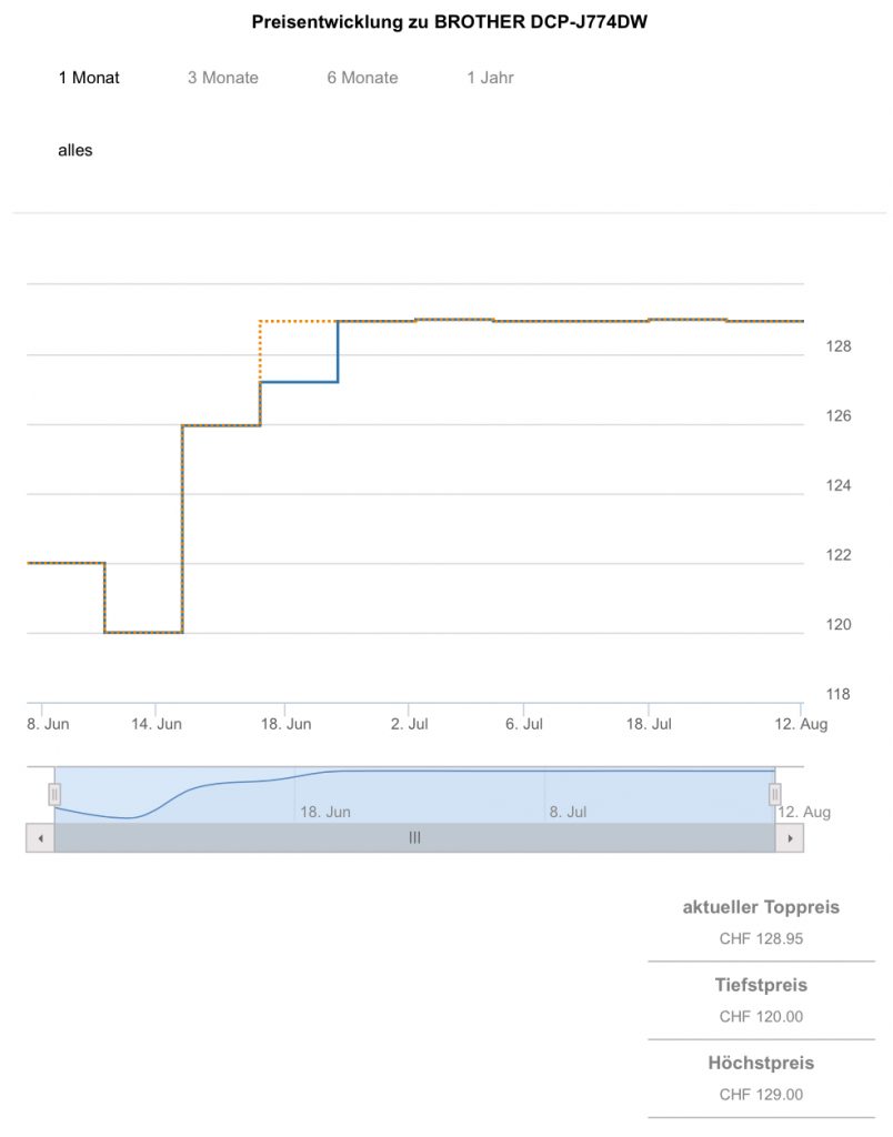 Gemäss toppreise gab es den Drucker bislang nie günstiger als für 120.- CHF. Der zweitbeste Preis liegt aktuell bei 128.95 CHF.