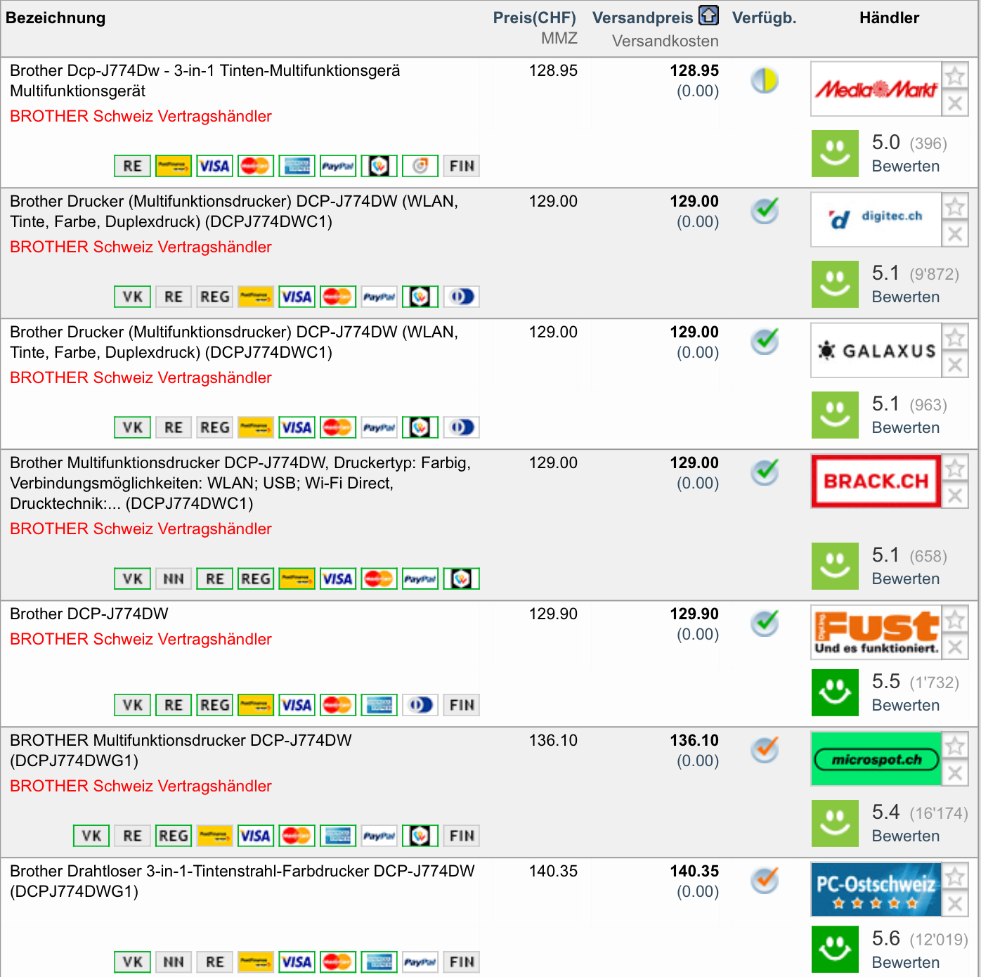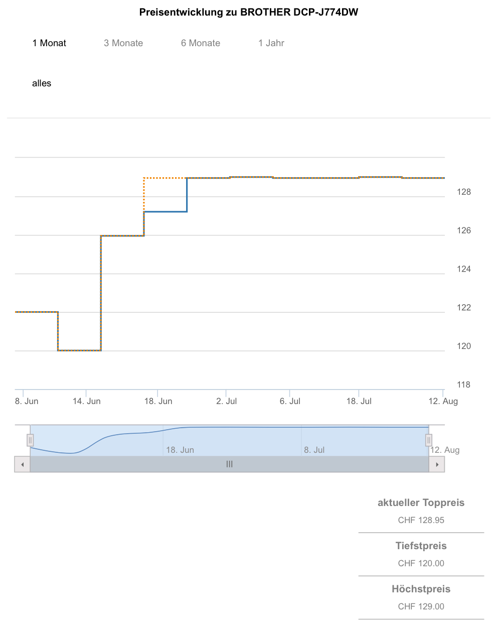 Gemäss toppreise gab es den Drucker bislang nie günstiger als für 120.- CHF. Der zweitbeste Preis liegt aktuell bei 128.95 CHF.