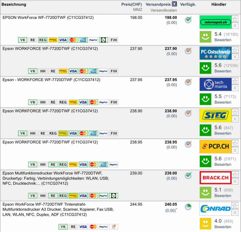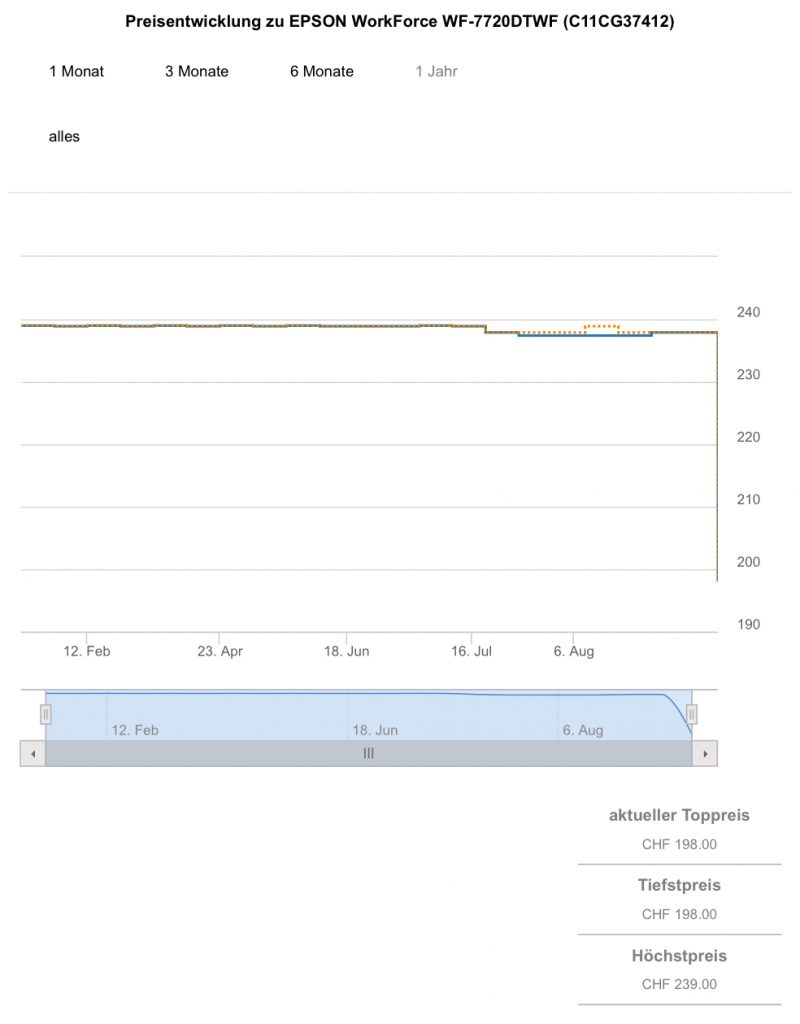 Gemäss toppreise gab es den Drucker bislang nie günstiger als für 237.90 CHF was gleichzeitig aktuell auch der zweitbeste Preis ist.