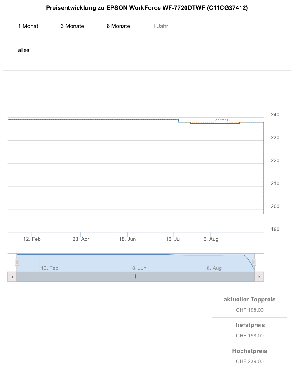 Gemäss toppreise gab es den Drucker bislang nie günstiger als für 237.90 CHF was gleichzeitig aktuell auch der zweitbeste Preis ist.