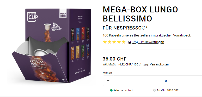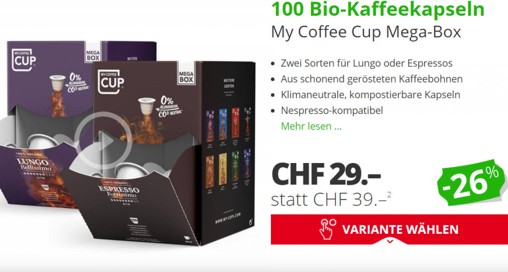 Bei DayDeal gibt es die My Coffee Cup Mega-Box (100 Stk) stark reduziert für CHF 29.-. Das zweitbeste Angebot, das ich gefunden habe, liegt bei CHF 36.- auf der Homepage.