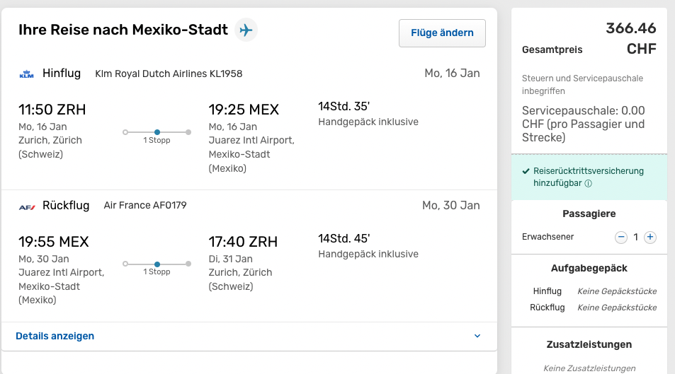 So bucht man auf eDreams ZRH-MEX mit KLM (Stop in Amsterdam) sowie MEX-ZRH mit Air France (Stop in Paris) ab CHF 366.45 pro Person. Im Preis ist jeweils nur ein Handgepäckstück enthalten. Ein Aufgabegepäck kann dazu gebucht werden.