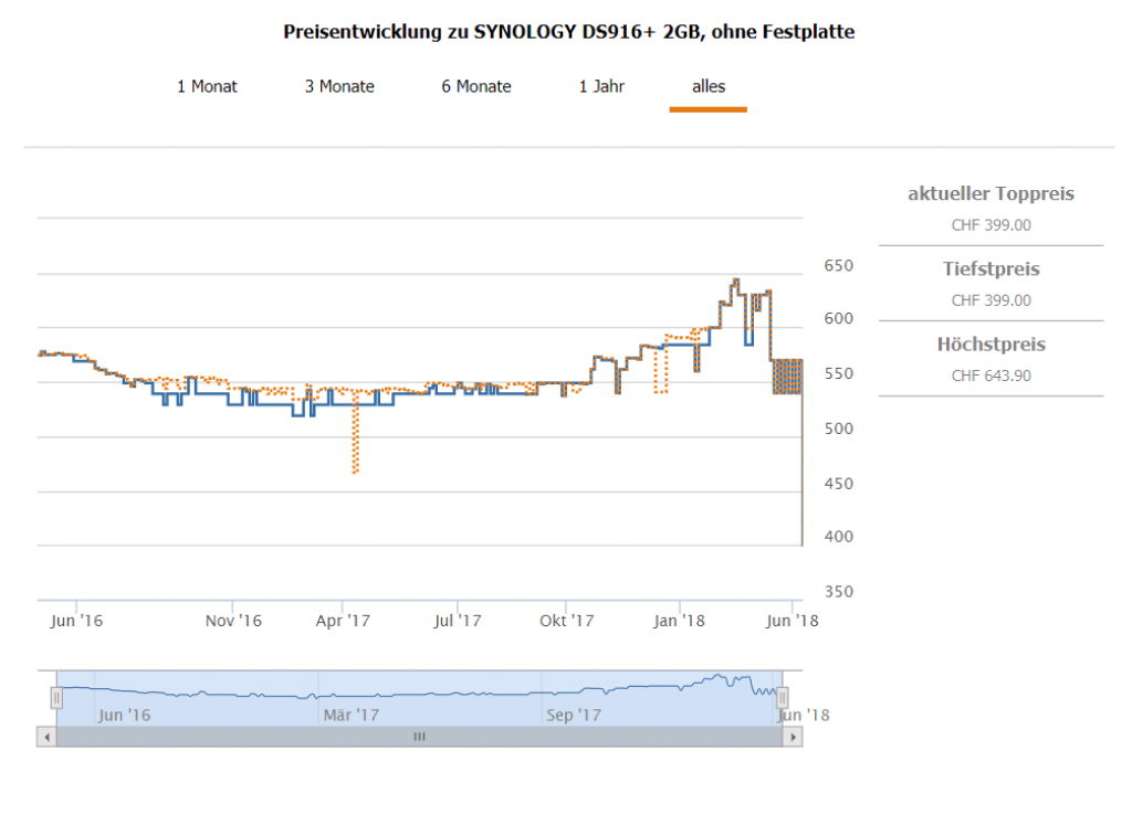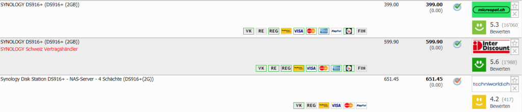 Bei microspot gibt’s grad den NAS (Dateiserver) Synologie DS916+ für CHF 399.- Den zweitbesten Preis bietet Interdiscount mit CHF 599.90. Unter CHF 466.- gab’s dieses NAS noch nie. Mit dem Gutscheincode HFWMSP20 gibt’s auf den Preis noch einmal CHF 20.- Rabatt. Somit bezahlst du sogar nur CHF 379.-