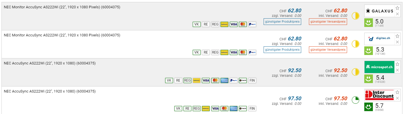Bei Galaxus und dem Partner Digitec gibt es den NEC AccuSync AS222Wi 22″ Monitor für den neuen Bestpreis von CHF 62.80. Der vorherige Bestpreis und auch zweitbeste Preis beträgt CHF 92.50.