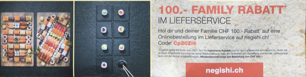 40.- CHF Rabatt im Lieferservice (Mindestbestellwert von 60.- CHF). Angebot gültig bis Ende Juni.
