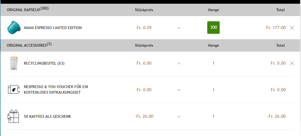 Danke für den Deal, der 50er und 100er Kapseln geschenkt Deal funktioniert.
