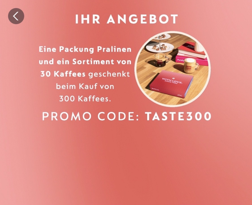 Beim Kauf von 300 Kaffees und mehr: Eine Packunge Cailler Pralinen und ein Sortiment von 30 Kaffees geschenkt mit dem Promo Code TASTE300