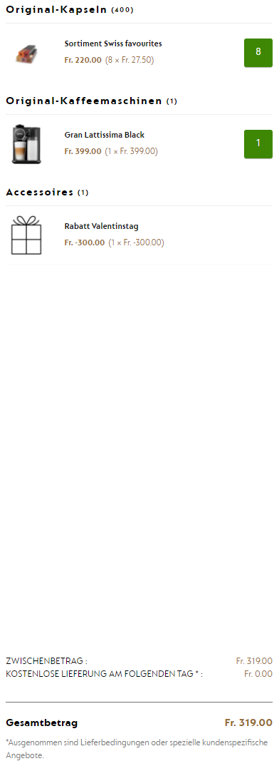 Diese gibt’s mit z.B. 400 Kapseln der „Swiss favourites“ zum attraktiven Preis von 319 Franken. Alleine die Maschine würde ansonsten knapp 259 Franken kosten. Ihr zahlt hier also noch 60 Franken für 400 Kapseln oder anders gesagt 15 Rappen pro Kapsel!