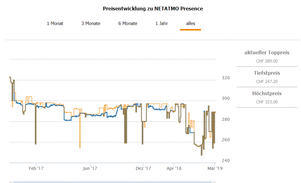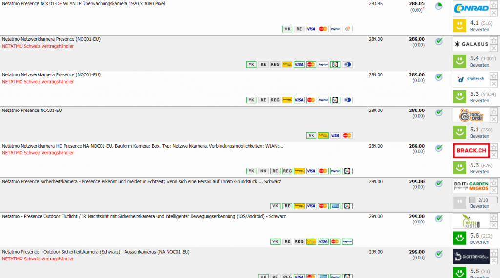 Bei DayDeal gibt’s heute die Kamera-Wandleuchte Netatmo HD Presence für CHF 229.- Laut toppreise war der Bestpreis bei CHF 247.20, zweitbester Preis im Moment beträgt CHF 288.05 bei Conrad.