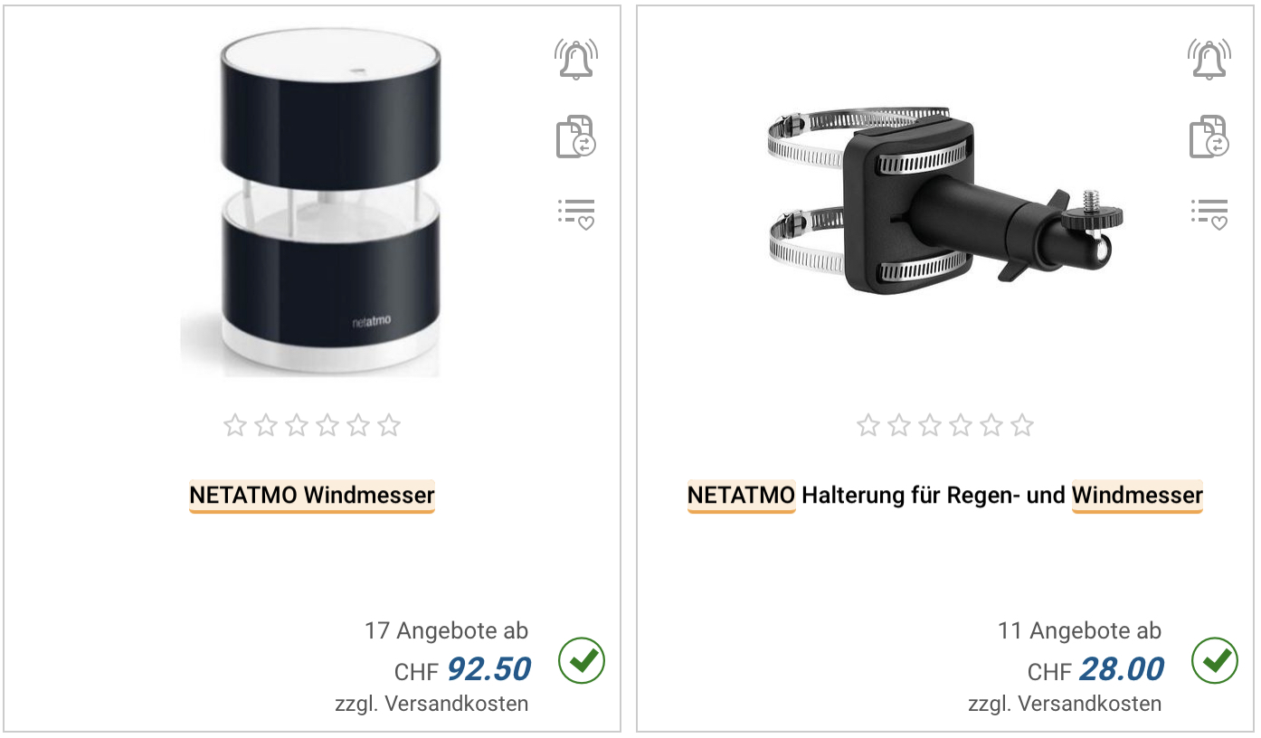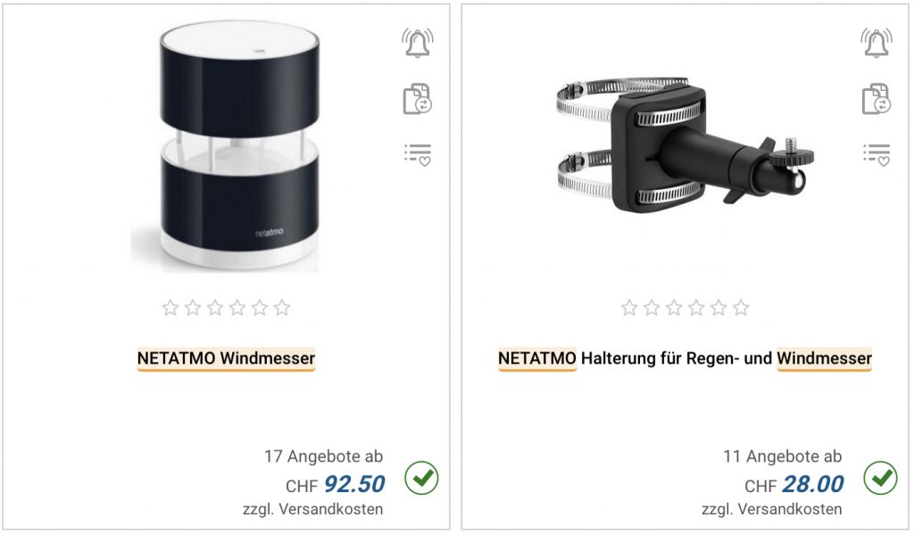 Bei Netatmo direkt gibt es heute noch als Teil des Black Friday Angebots, den Windmessr inklusive (!) der Halterung für insgesamt 40.- weniger! Vergleichspreis setzt sich aus den günstigsten Preisen für den Windmesser und der Halterung zusammen.