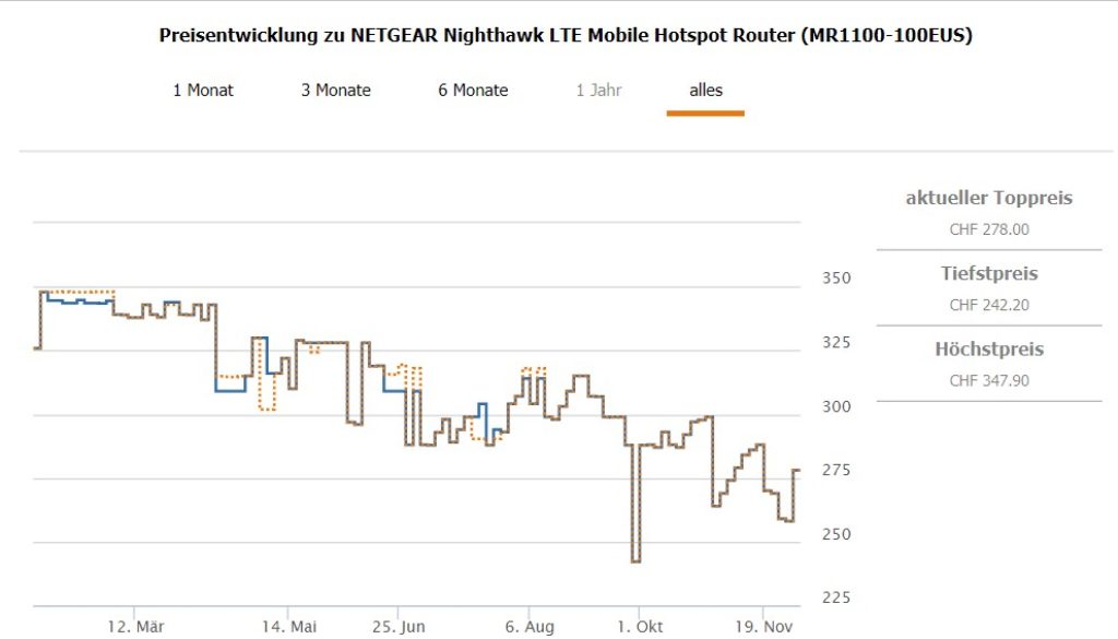 Im digitec Tagesdeal gibt’s heute das Netgear Nighthawk M1 Gigabit LTE Modem für CHF 219.- Bisheriger Bestpreis in der Schweiz laut toppreise war bei CHF 242.20, momentan zweitbester Preis liegt bei CHF 278.-
