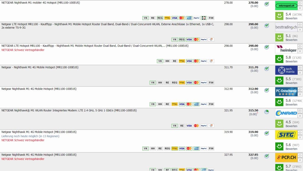 Im digitec Tagesdeal gibt’s heute das Netgear Nighthawk M1 Gigabit LTE Modem für CHF 219.- Bisheriger Bestpreis in der Schweiz laut toppreise war bei CHF 242.20, momentan zweitbester Preis liegt bei CHF 278.-