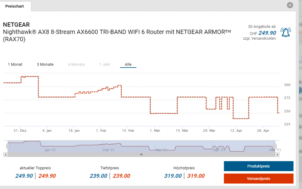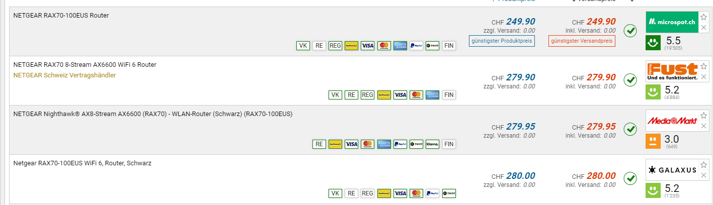 Bei Microspot gibt es den Netgear Nighthawk RAX70 Gaming-Router für CHF 249.90. Letzte Woche war der Preis einmal um CHF 10.- günstiger. Der zweitbeste Preis beträgt CHF 279.90.