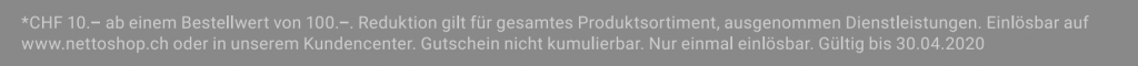 Bei nettoshop gibt’s mit dem Code NETTO-10 gerade 10.- Rabatt auf alles (ausser Dienstleistungen) ab einem Bestellwert von CHF 100.- Gültig bis am 30. April.