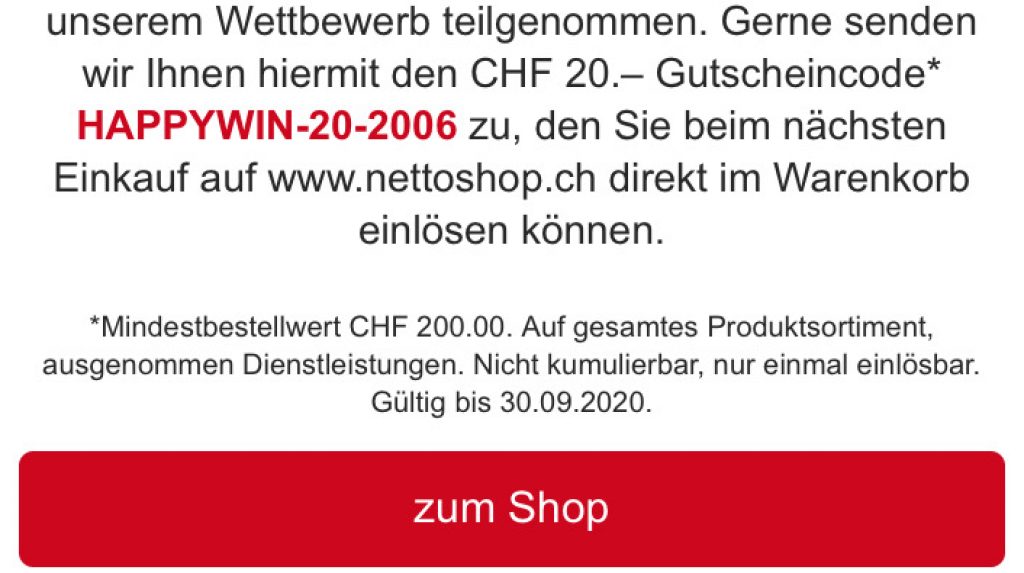 Mindestbestellwert CHF 200. Auf gesamtes Produktsortiment, ausgenommen Dienstleistungen. Nicht kumulierbar, nur einmal einlösbar. Gültig bis 30.09.2020.