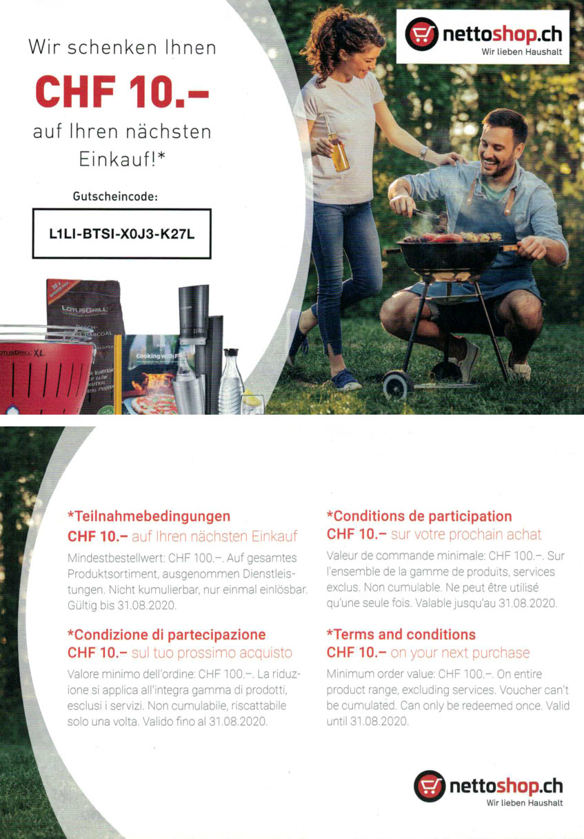 Bei nettoshop gibt es mit dem Code L1LI-BTSI-X0J3-K27L einen Rabatt von CHF 10.- Rabatt auf alles (ausser Dienstleistungen) ab einem Bestellwert von CHF 100.- (gültig bis 31.8.2020).