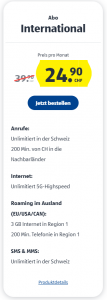 Und dann noch der International für CHF 24.90 mit 200min in die Nachbarländer telefonieren, 3GB Roaming monatlich + 200min im Roaming telefonieren
