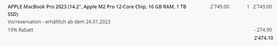 Bei Interdiscount könnt ihr euch bereits jetzt die 2023er MacBooks mit dem bekannten 10% Gutschein zum besseren Preis sichern! Im Vergleich zur Händlerkonkurrenz keine grosse Ersparnis, dafür aber der tiefste Preis für Vorbestellungen 😉