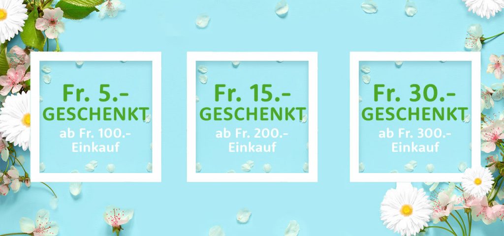 *Fr. 5.- geschenkt ab Fr. 100.- Warenwert, Fr. 15.- geschenkt ab Warenwert Fr. 200.-, Fr. 30.- geschenkt ab Warenwert Fr. 300.- (Depot und Lieferkosten exkl.). Angebot gültig vom 18.03. bis 27.03.2019 einmal pro Haushalt. Nicht gültig für Spirituosen und nicht mit einem anderen Promo-Code kumulierbar.