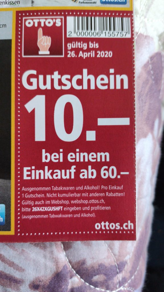 Bei Ottos gibt’s wieder einmal einen neuen Gutscheincode. Mit dem Code 26X42XGUSHFT gibt’s 10.- Rabatt ab einem Bestellwert von 60 Franken.