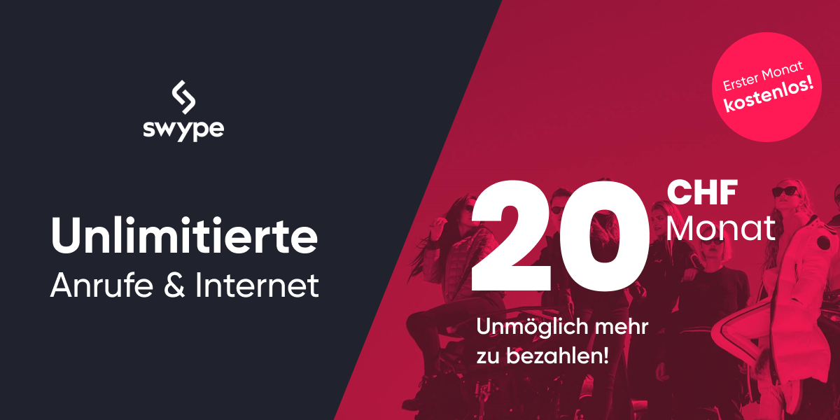 Mit all dem will Swype (yallo-Tochter) nun Schluss machen und lanciert ein Abo, das alle Schweizer Inklusivleistungen ohne Limitierungen abdeckt. Und das zu einem Kampfpreis von CHF 20.- pro Monat resp. CHF 1.50 pro Tag!