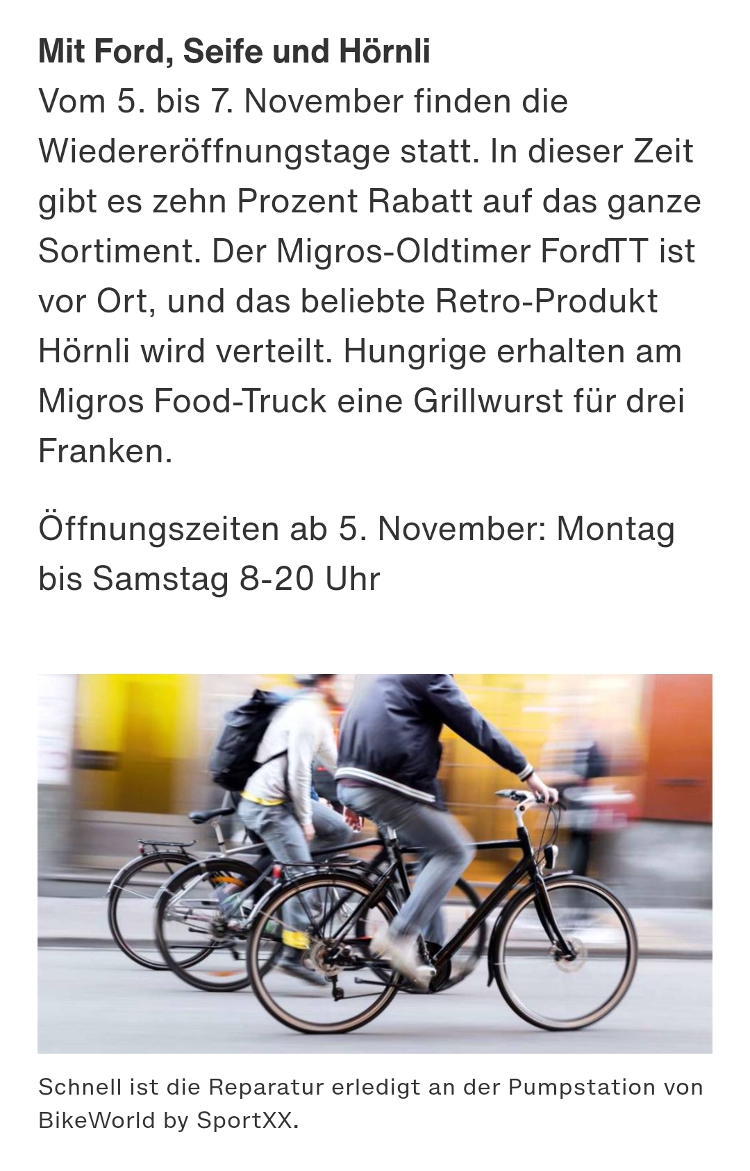 Ab dem 5. November eröffnet die Migros-Filiale nach dem Umbau im Dübendorfer Stadtzentrum wieder ihre Pforten. Dies wird gebührend mit der Ausstellung eines (scheinbar alten, traditionellen) FordTT, Grillwürsten für 3 Franken und weiteres gefeiert. Was am interessantesten sein dürfte ist allerdings der Rabatt von 10% aufs GANZE Sortiment.