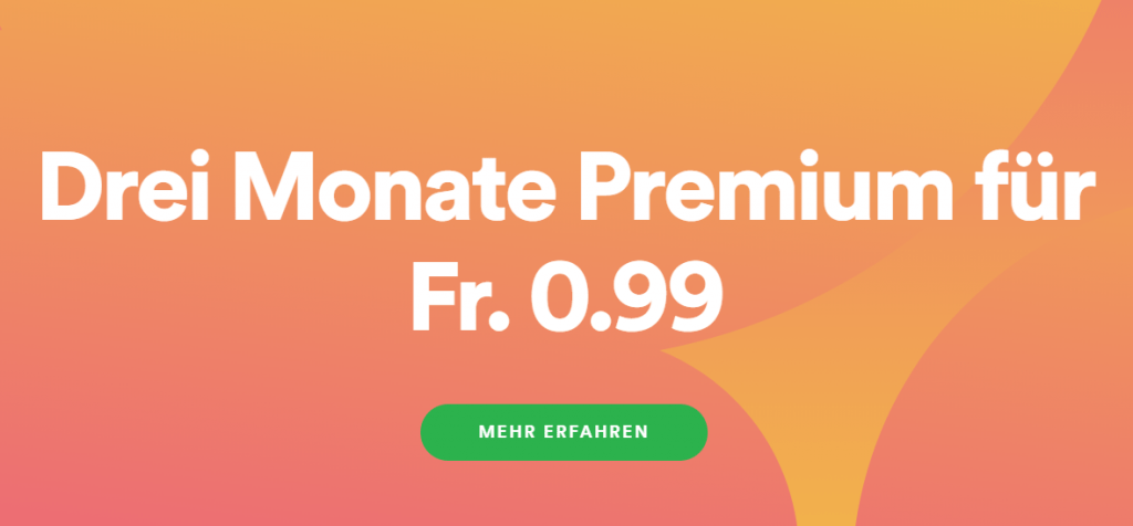 Wer nicht bereits vom philippinischen Spotify Preis profitiert, kann sich nun als Neukunde einen Premium-Zugang für 3 Monate für gerade einmal 33 Rappen pro Monat bzw. 99 Rappen insgesamt sichern. Das Abo wandelt sich nach Ablauf der drei Testmonate automatisch in ein normales Premium-Abo um. Deswegen / wichtig: Testmonate abschliessen und direkt das Abo kündigen. Die drei Testmonate laufen trotzdem weiter.