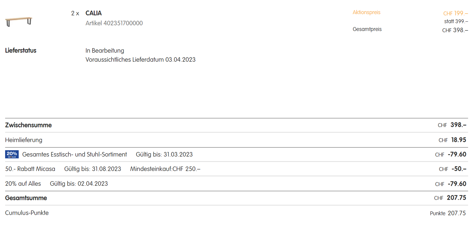 Hab mir mal 2x Calia-Bänke gegönnt für ca. 205 CHF inkl. Versand (statt 798 CHF). Ersten Möbel von Micasa, hoff, sie sind besser als ihr Ruf ;_)