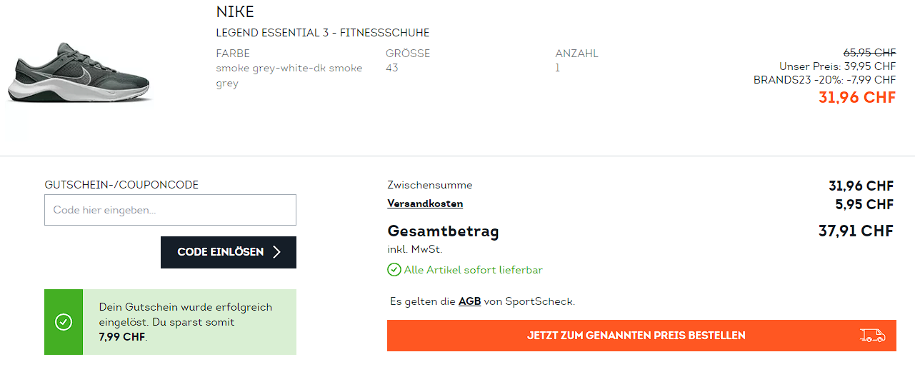 Bei SportScheck gibt’s derzeit die Sneakers Legend Essential 3 von Nike zu tiefen Preisen. Zum Beispiel könnt ihr euch die graue Farbvariante für knapp 38 Franken inkl. Lieferung sichern! Hierbei stehen euch noch die Grössen 42 bis 47 zur Auswahl: