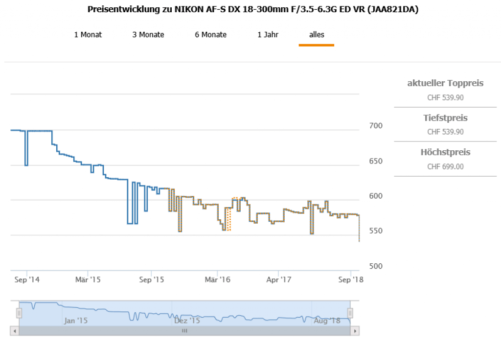 Das Objektiv gab es bislang noch nie günstiger als für 551.90 CHF, der zweitbeste Preis liegt aktuell bei 578.- CHF.