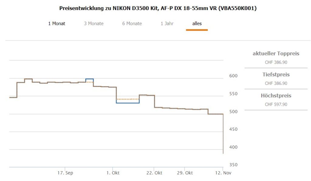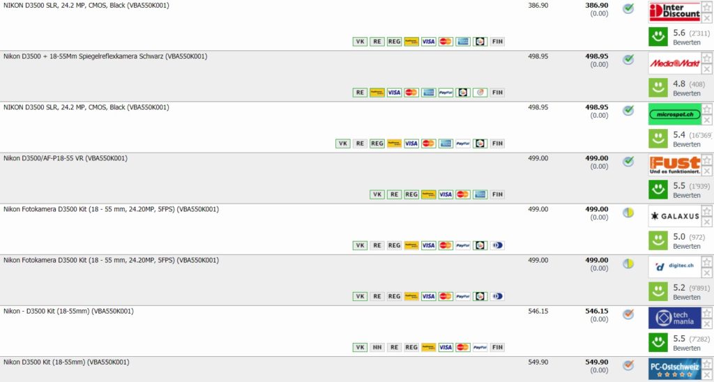 Bei Interdiscount erhält man gerade das NIKON D3500 Kit, AF-P DX 18-55mm VR Kit für CHF 386.90, mit dem Gutscheincode HFWID10 sogar noch 10 Franken günstiger. Zweitbester Preis in der Schweiz: CHF 498.95, was ebenfalls der Bestpreis war.