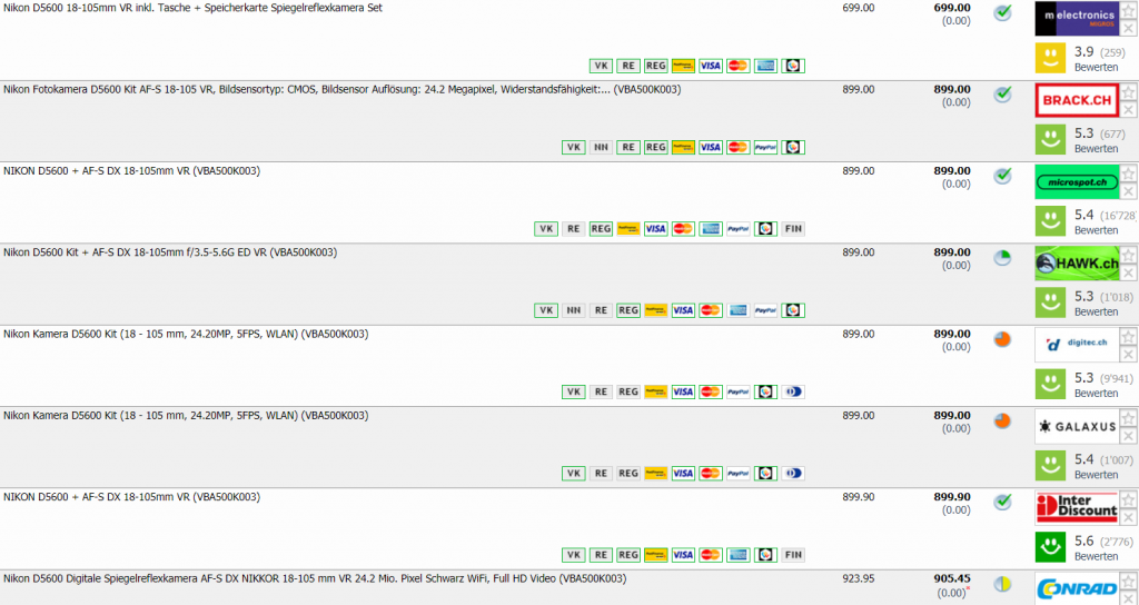 Bei melectronics erhält man im Moment die Nikon D5600 18-105mm VR inkl. Tasche + Speicherkarte in Aktion für CHF 699.- Meldet man sich zum Newsletter an, erhält man einen 10.- Gutschein, der sich kombinieren lässt. So bezahlt man noch CHF 689.- Zweitbester Preis in der Schweiz liegt bei CHF 899.- Bestpreis war bei CHF 719.- (nimmt man den Preisfehler aus, siehe Screenshot)