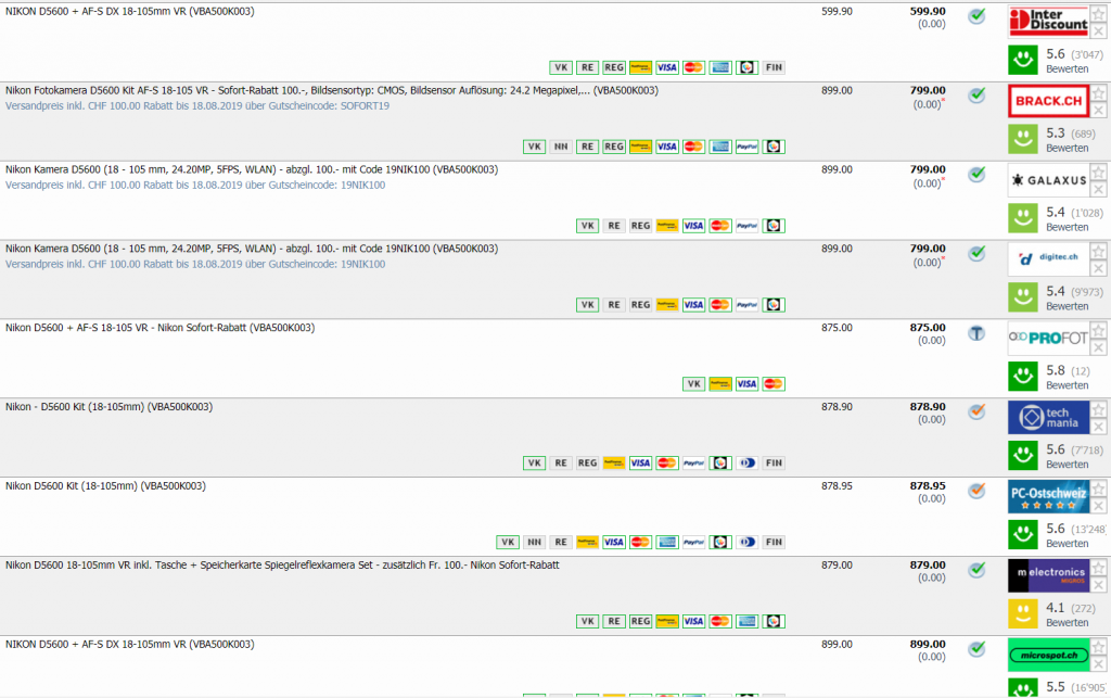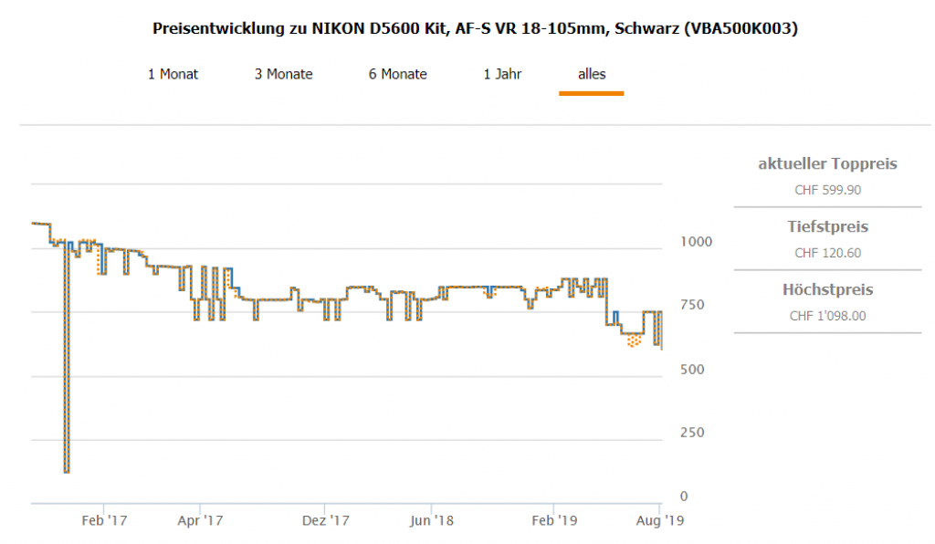 Bei Interdiscount erhält man das DSRL-Kit NIKON D5600, AF-S VR 18-105mm für CHF 599.- Zweitbester Preis ist bei CHF 799.- Bestpreis war bei CHF 622.40 - der Strich nach unten im Preisverlauf dürfte ein Preisfehler gewesen sein.