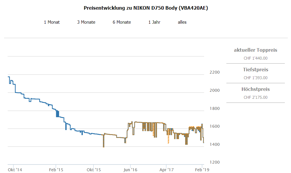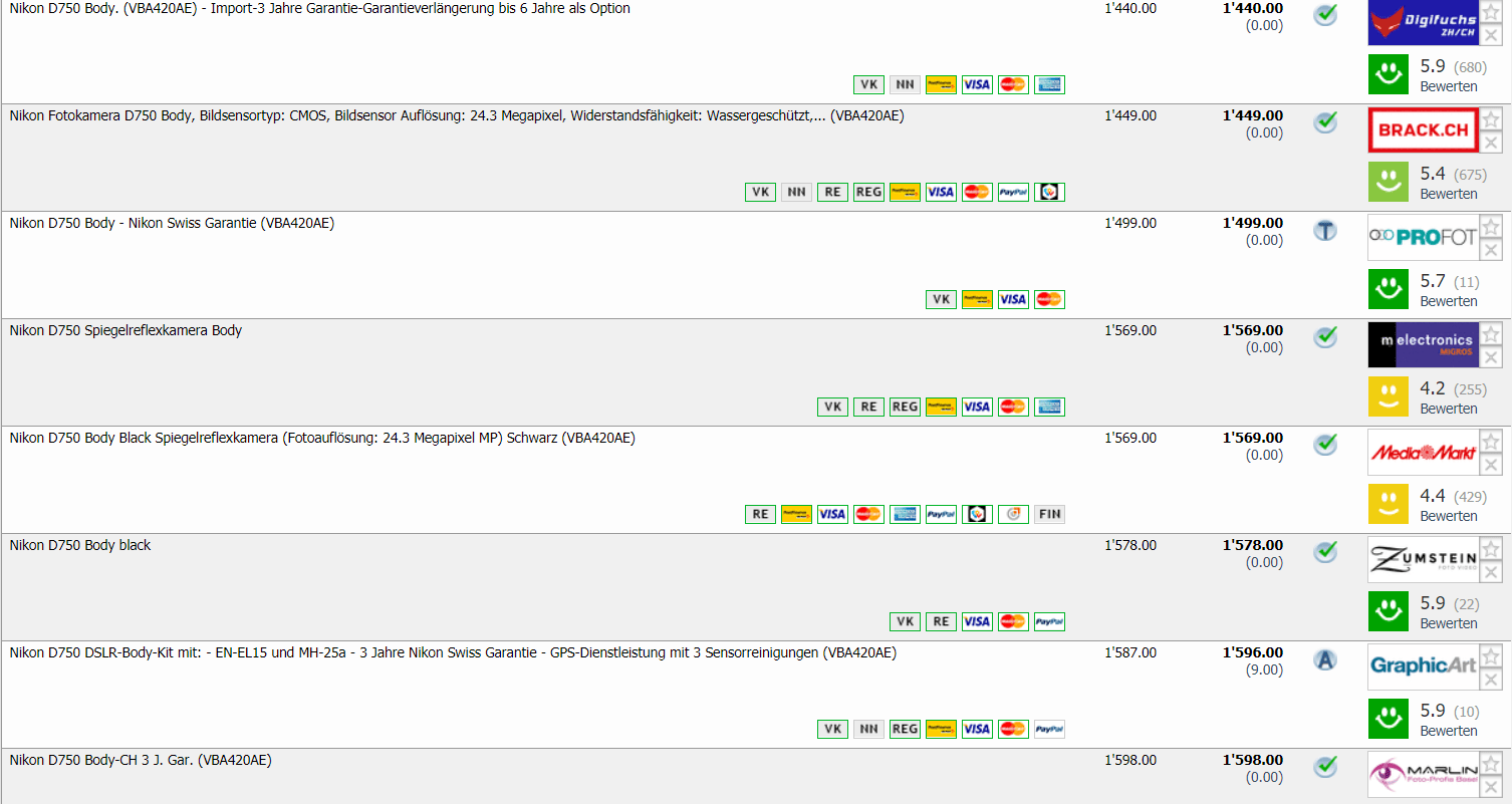 Bei digitec erhält man gerade die Nikon D750 Body (24.30MP, 6.50FPS, WLAN) für CHF 1’249.- Zweitbester Preis laut toppreise beträgt CHF 1’440.- Bestpreis war lt. toppreise bei CHF 1’393.-