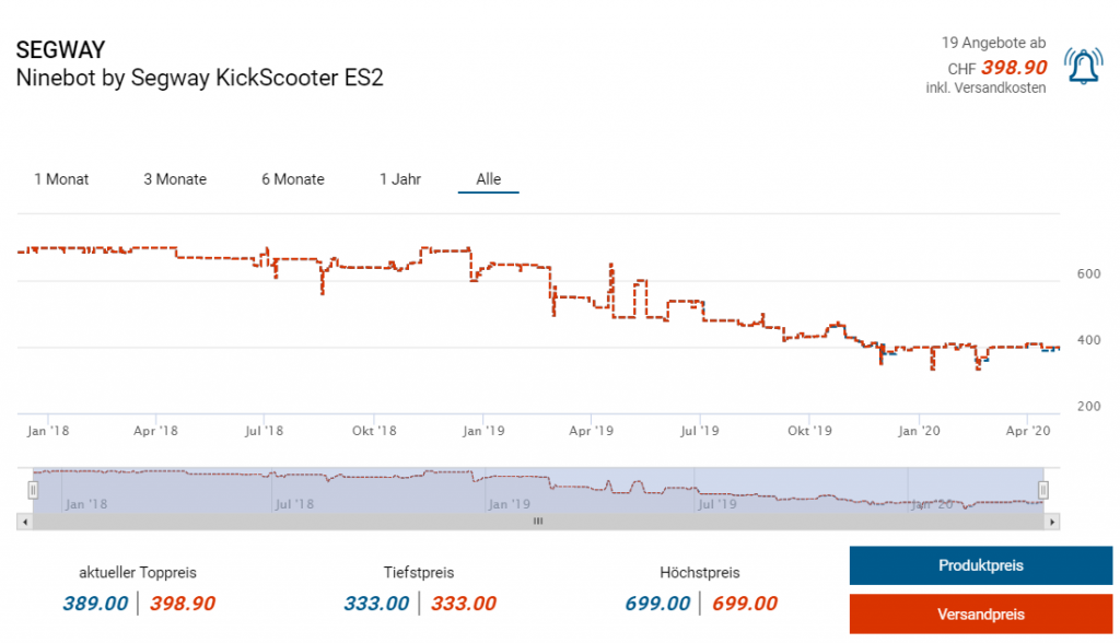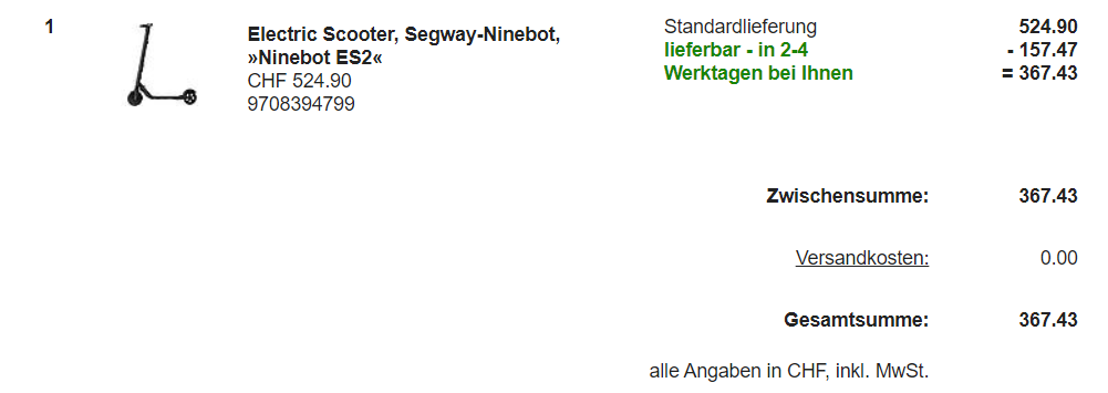 So ergeben sich einige interessante Angebote, unter anderem der E-Scooter Ninebot ES2. Laut toppreise gabs diesen bereits einmal für 333 Franken, derzeit werden aber mind. CHF 398.90 fällig. Mit den 30% Rabatt ergibt sich bei Quelle der Preis von etwa 367 Franken.