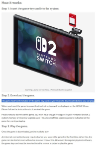 -> Game-key cards are different from regular game cards, because they don’t contain the full game data. Instead, the game-key card is your "key" to downloading the full game to your system via the internet.