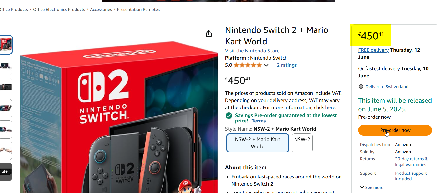 Die Nintendo Switch 2 zusammen mit Mario Kart World kostet auf Amazon.fr aktuell 450 Euro, was umgerechnet etwa 418 Schweizer Franken entspricht.