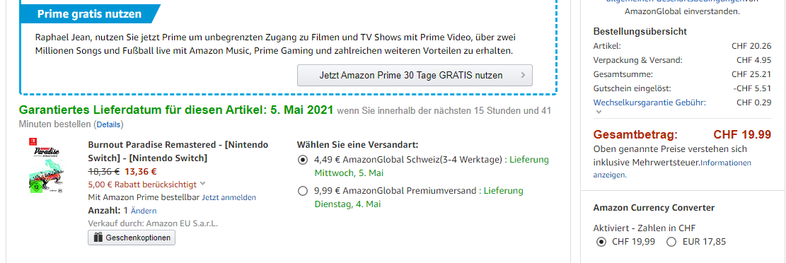 - Für Lieferungen in die Schweiz wird der Preis erst bei Angabe einer Schweizer Lieferadresse richtig angezeigt (Abzug der Mehrwertsteuer, zuzüglich Versandkosten) resp. beim Checkout an der Kasse (Amazon Frankreich, Italien, Spanien und Grossbritannien). Wir verwenden grundsätzlich den Interbanken-Kurs für die Umrechnung in CHF.