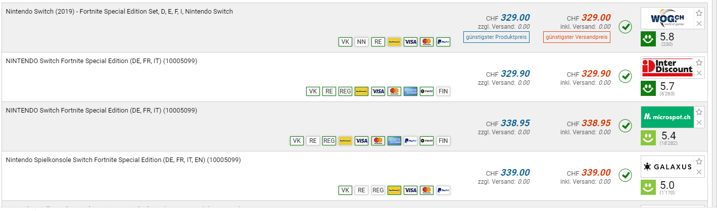 Bei Amazon FR gibt es die Nintendo Switch in der Fortnite Edition für den neuen Bestpreis von CHF 289.-. Der vorherige Bestpreis war CHF 296.90. Der zweitbeste Preis beträgt CHF 329.-.