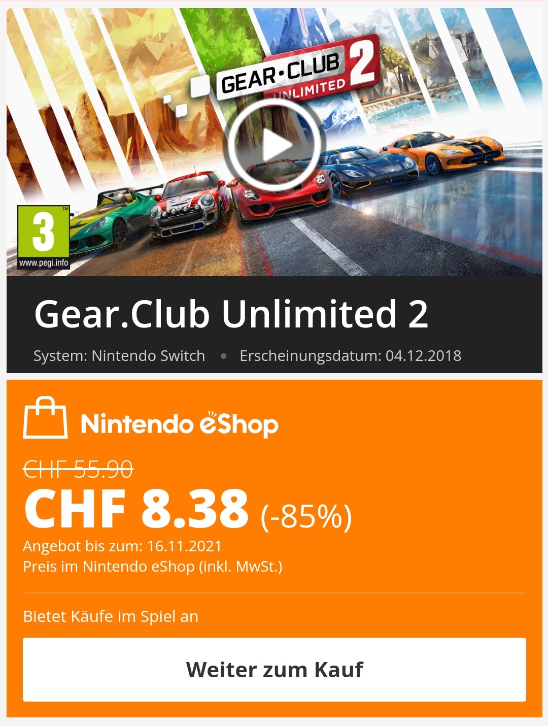Aktuell gibt es das Rennspiel Gear Club 2 Unlimited für CHF 8.38 statt CHF 55.90 im Nintendo eShop.