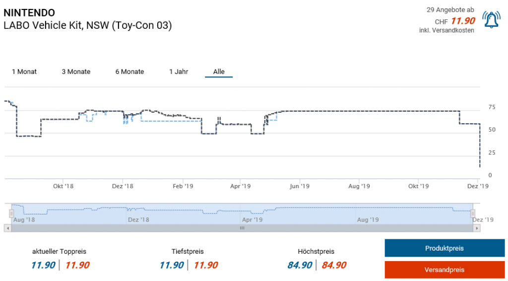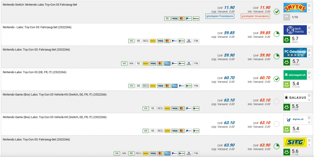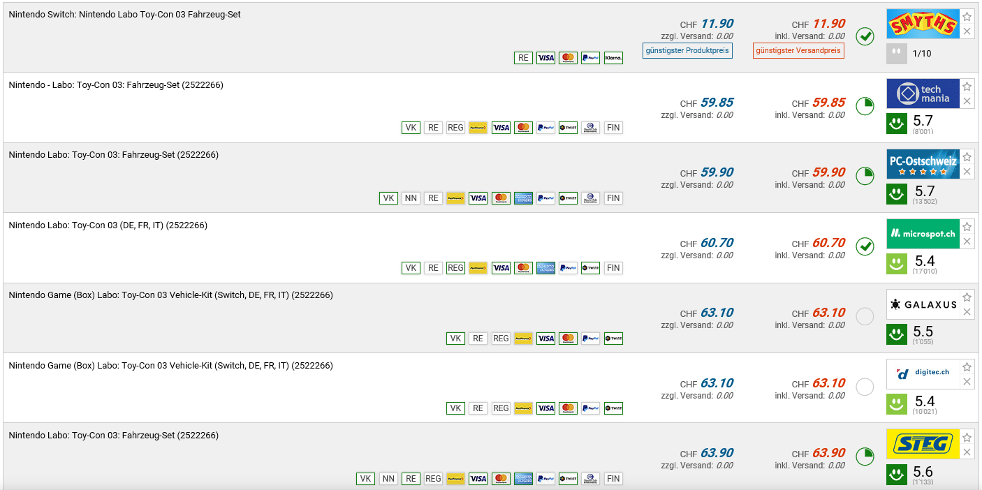Bei Smyths Toys gibt es aktuell das NINTENDO SWITCH LABO Vehicle Kit (Toy-Con 03) für 11.90 CHF. Zweitbester Preis gemäss toppreise sind 59.85 CHF.