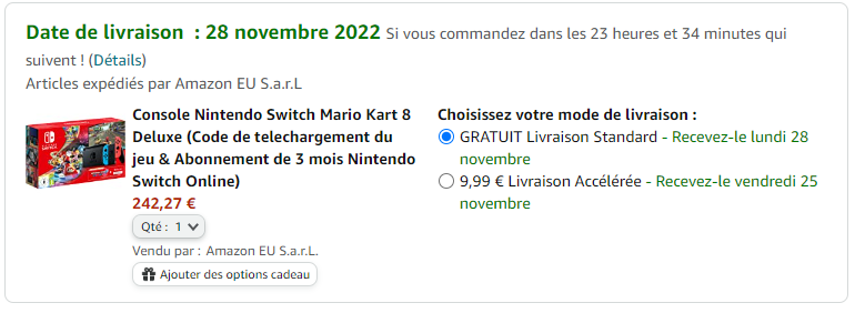 Bei amazon.fr gibts die Nintendo Switch Mario Kart 8 Deluxe Edition zum Bestpreis von CHF 239.-. Der zweitbeste Preis in der Schweit liegt bei CHF 274.- ohne das Spiel und die 3 Monate Switch Online!
