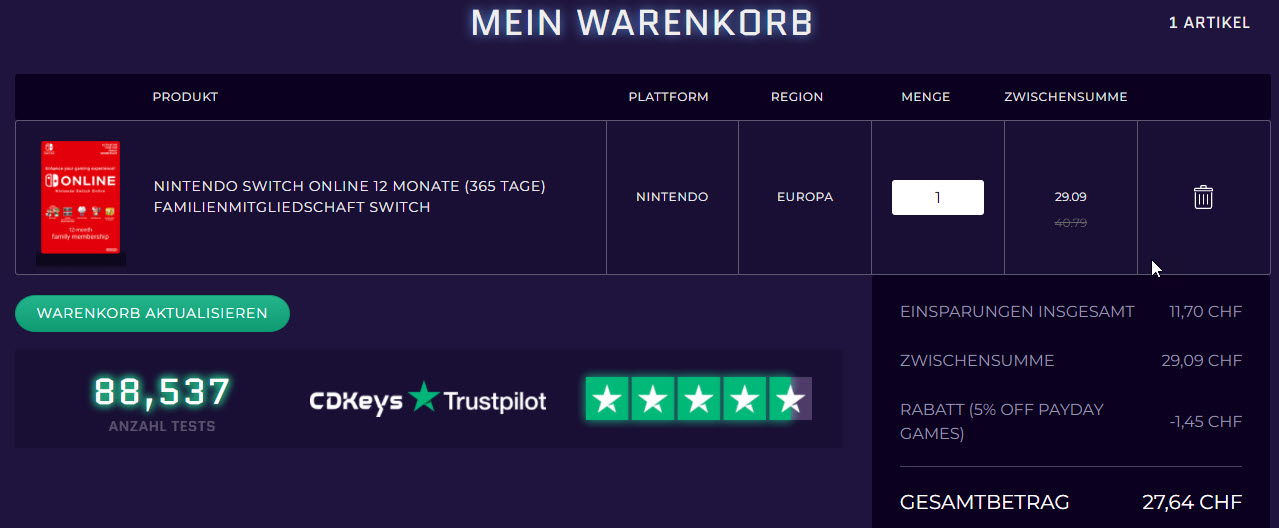 Bei Cdkeys.com gibt es aktuell mit dem Gutscheincode „Brains“ die Nintendo Switch Online Familienmitgliedschaft zum Preis von ca. CHF 28.-