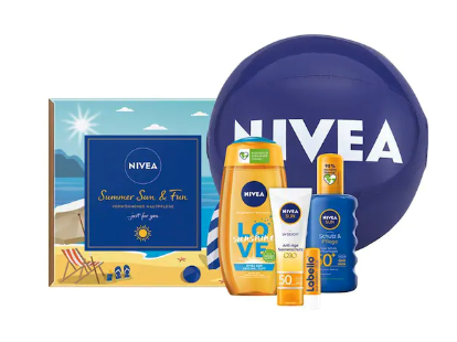 Das Summer Sun & Fun Set von Nivea hat alles, was die Haut an einen sonnigen Sommertag braucht. Das Set kommt mit vier fantastischen pflegenden und schützenden Produkten. Das Sonnenschutzspray kann ganz einfach aufgetragen werden, zieht schnell ein und schützt die Haut effektiv vor Schädigungen durch Sonneneinstrahlung. Der UV Gesicht Anti-Age Sonnenschutz Q10 wurde speziell für die empfindliche Haut im Gesicht entwickelt und hat wertvolle Anti-Aging- und Pflege-Eigenschaften. Und auch die Lippen werden geschützt: Der Labello Sun Protect mit LFS 30 schützt die Lippen und pflegt sie gleichzeitig geschmeidig weich. Am Abend kann der Sonnenschutz ganz einfach mit der Pflegedusche Love Sunshine abgewaschen werden.