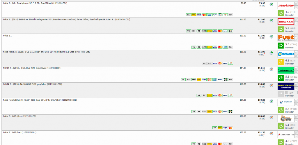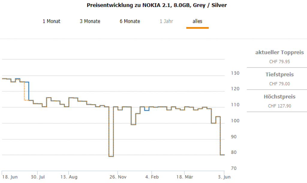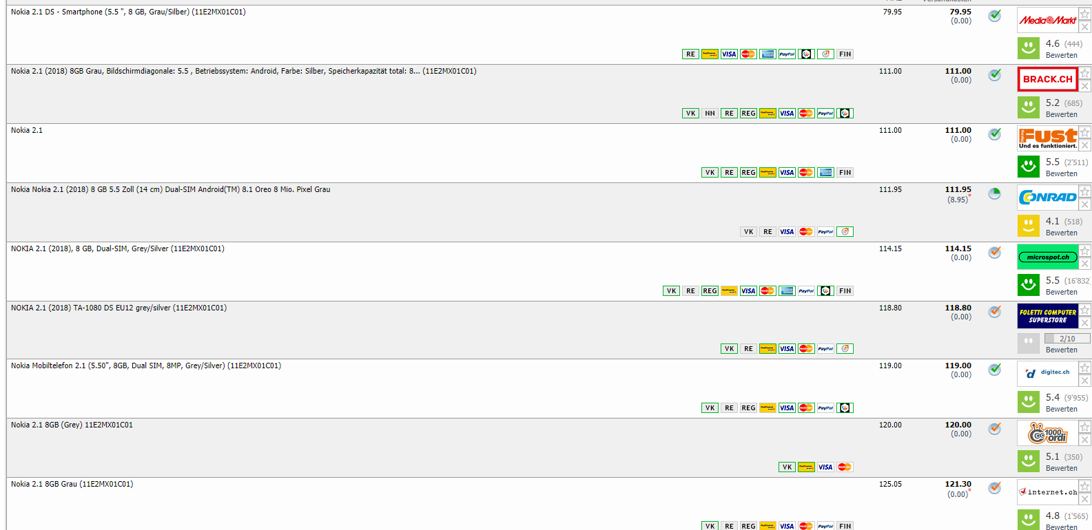 MediaMarkt bietet aktuell das NOKIA 2.1 DS - Smartphone (5.5 „, 8 GB, Grau/Silber) für CHF 79.95. Das liegt nur wenige Rappen über dem Bestpreis von CHF 79.-. Der aktuelle Vergleichspreis liegt bei CHF 111.-.