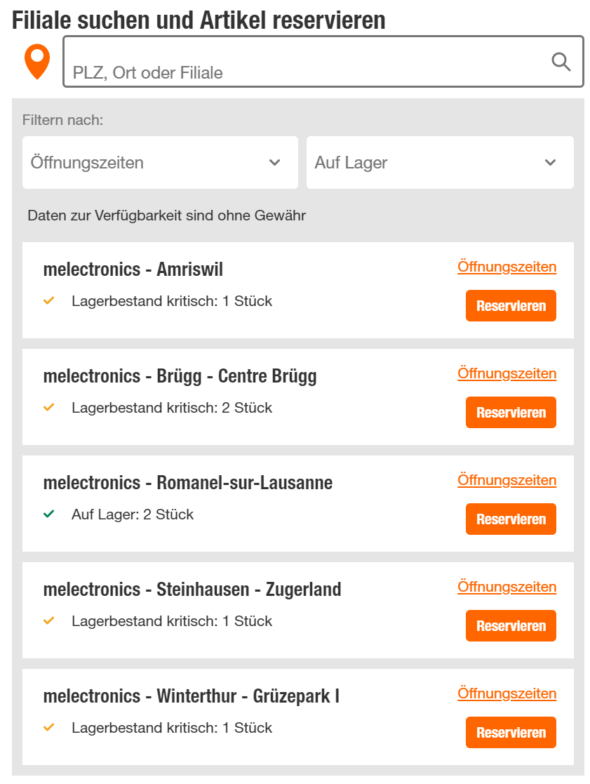 Per Click&Collect ist es in 4 Filialen verfügbar, Steinhausen, Winterthur, Amriswil und Brügg.