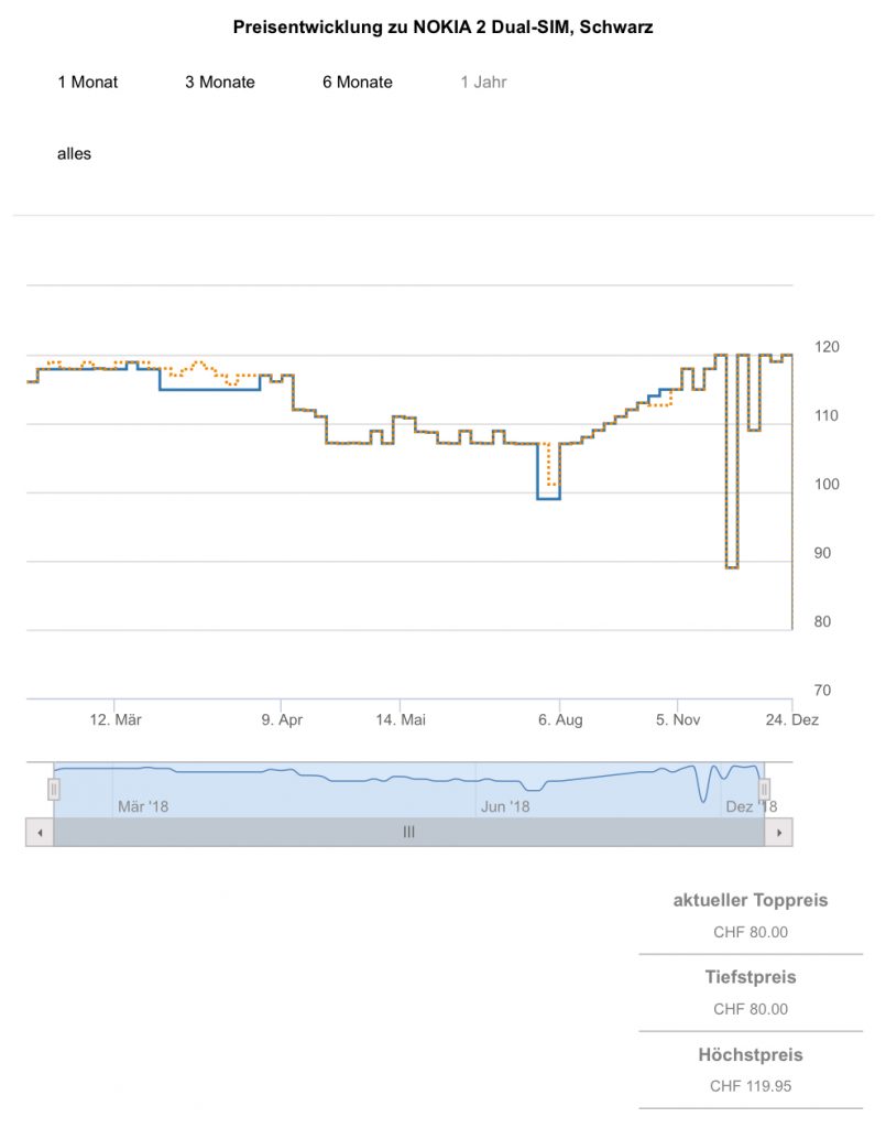 Bei techmania gibt es aktuell das NOKIA 2 Dual-SIM für 80.- CHF.